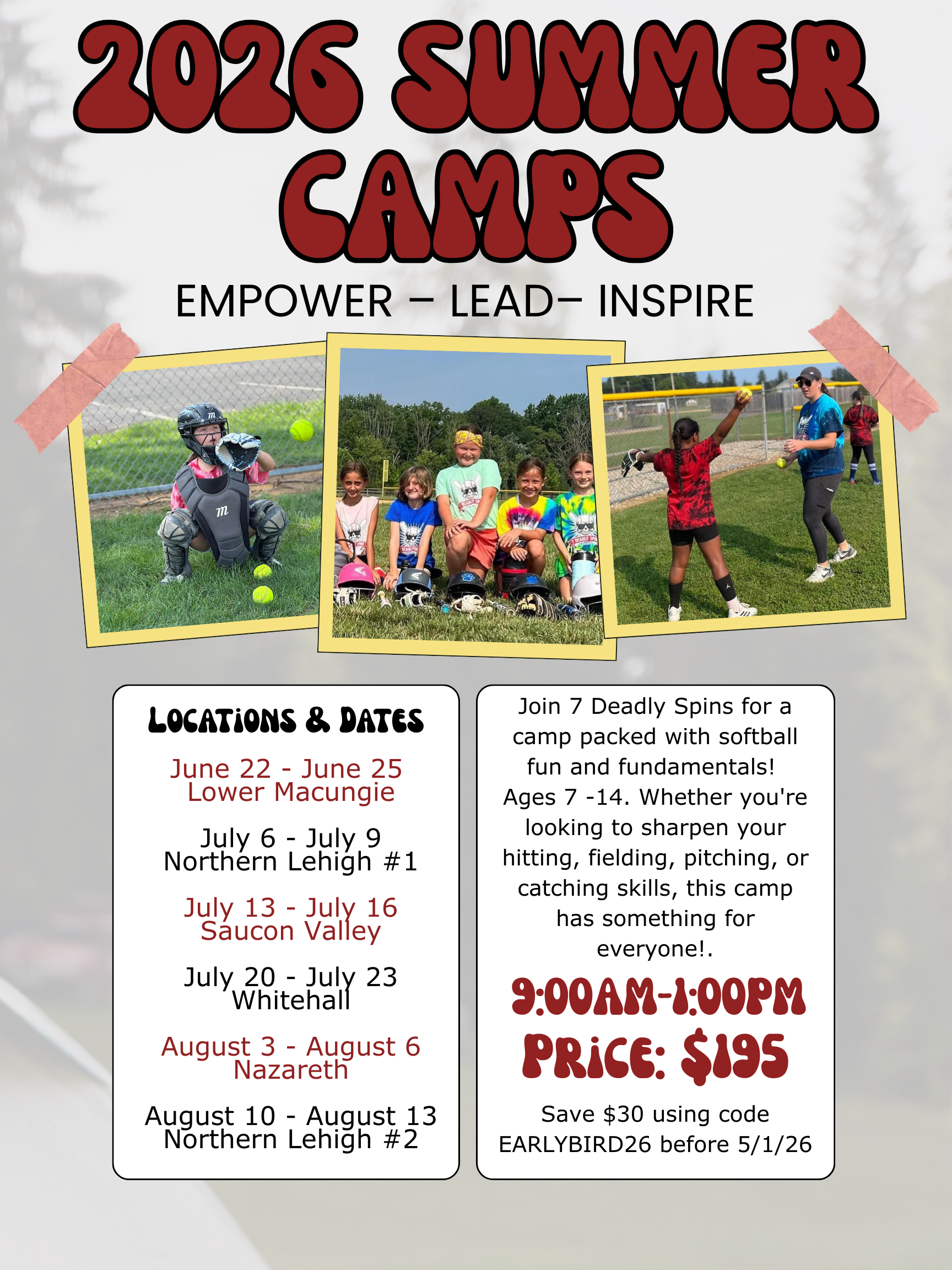 Join 7 Deadly Spins Fastpitch this summer for a fun, high-energy softball camp focused on building strong fundamentals and confidence on the field. Our camps are designed for athletes of all skill levels and provide a positive environment where players can learn, grow, and compete.